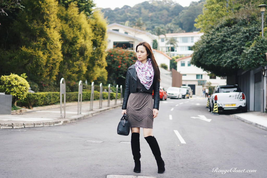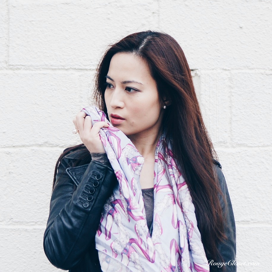 To live up a dark colour combo like black and dark brown, an interesting scarf can be a pretty good option.  I usually choose scarf in square dimension as it can be easily formed into different shapes and styles.  This Doll Memories Shoe Addict scarf comes in good 133cm x133cm size.  I can play around it onto myself.  It is made from wool and modal.  Perfect for the weather right now.