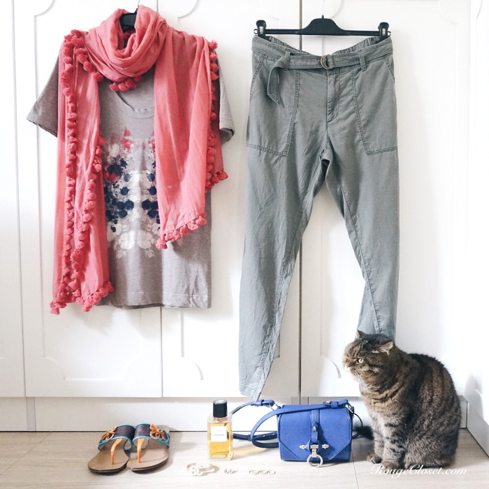 I used not a khaki fan. But when army green back to the trend, the khaki seems to become my option for a level down, casual picks. To lighten up the earthy and ashy tone, I put on my favourite peach Anteprima scarf and my blue Givenchy Obsidia bag. For shoes, oh don’t look at my legs, though I love this Etro sandals very much.