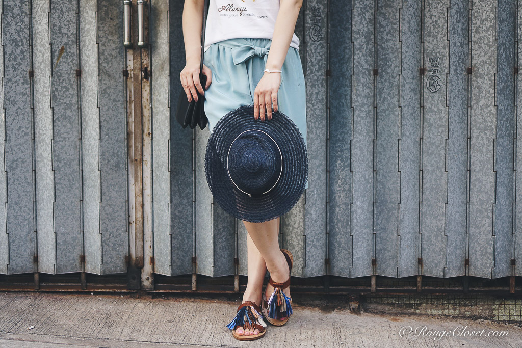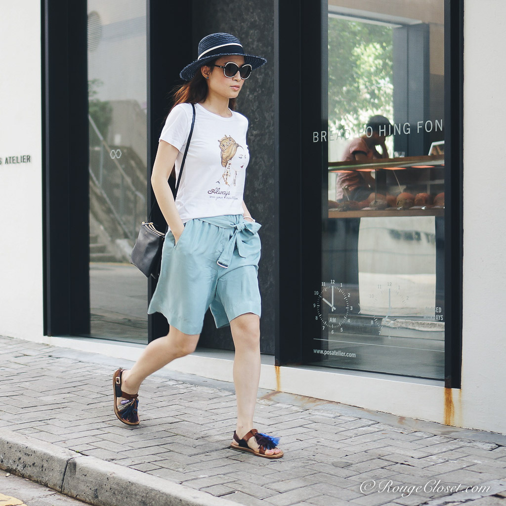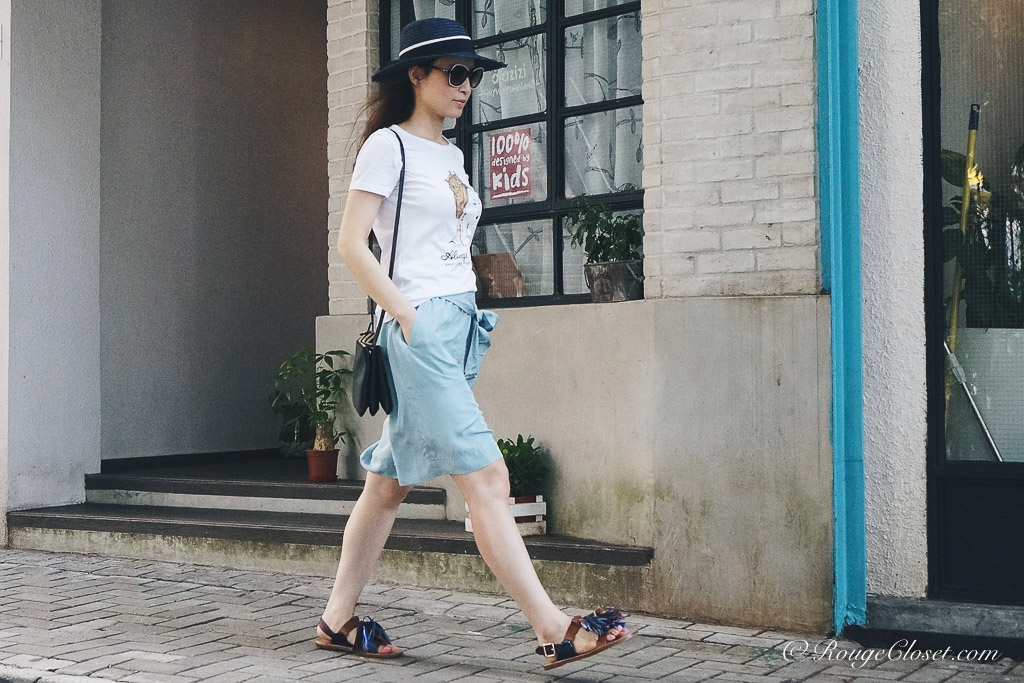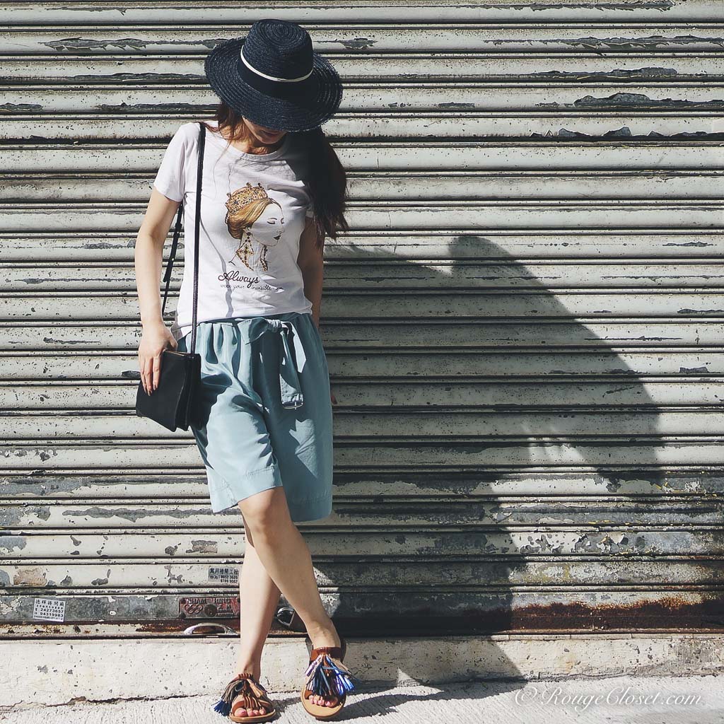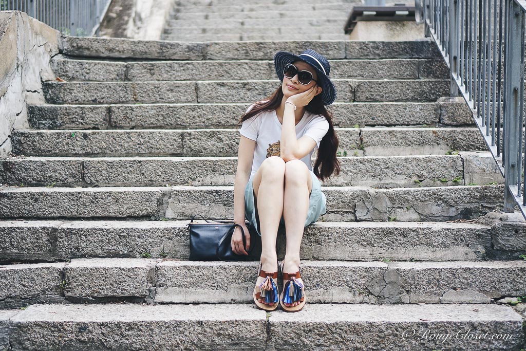It’s so hot this summer and the best casual outfit will surely be a white cotton tee and a pair of silk shorts. To dress your casual chic outfit with more sophistication, choose the right accessories. I love my sandals with tassels which add a lot more details and movement to the shoes. Put on a straw hat. Not only it can shield you from the fierce sun light, it lifts your outfit to another level.