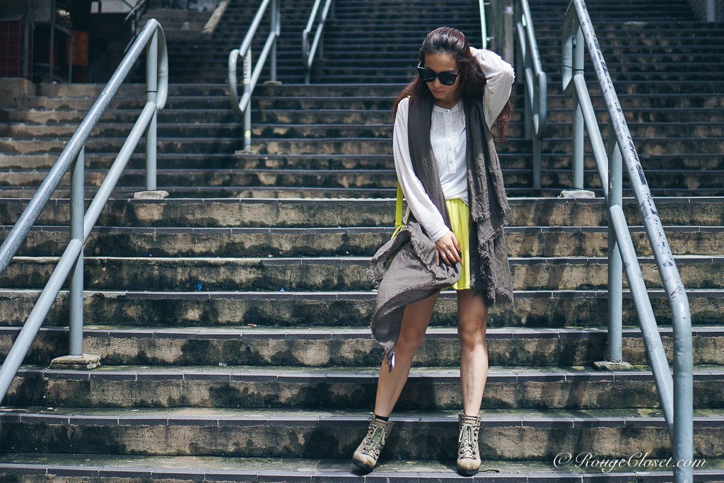 The colour combination of Yellow and Khaki is one of my favourite colour combo. It is comfortable to your eyes and the two colours compliment to each other. Too add an airy scarf is my way of summer layering. Not only it can keep you chic with layers, it is also a good way to keep you warm in air-conditioned indoors. Too add details to the look, I carried my yellow Lady Dior micro bag. The yellow on yellow effect increases the depth of the look. This little cute lady is versatile to style. Because it is so tiny, even the most extravagant colour, it will still be easy to style.