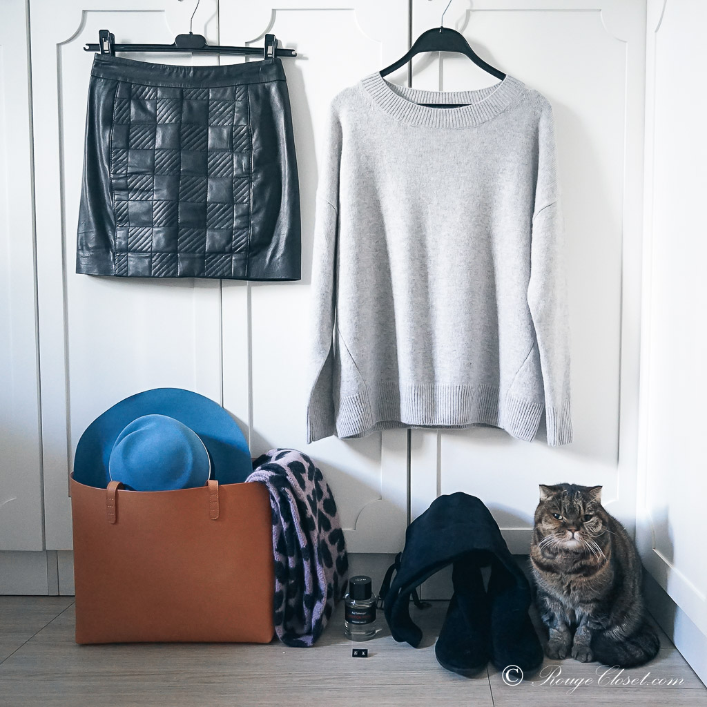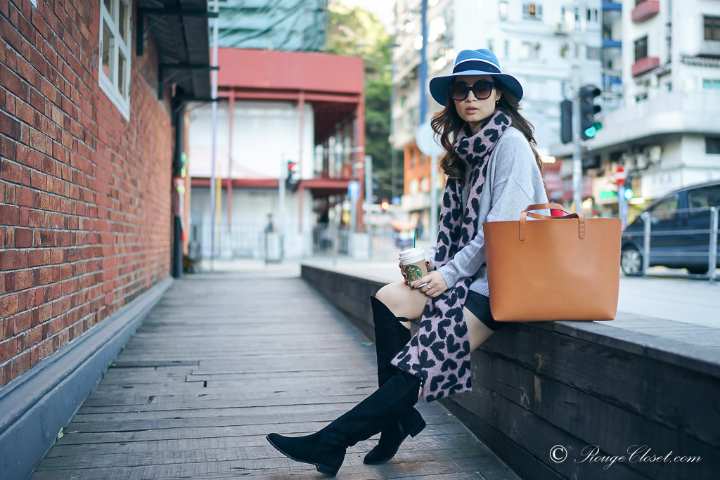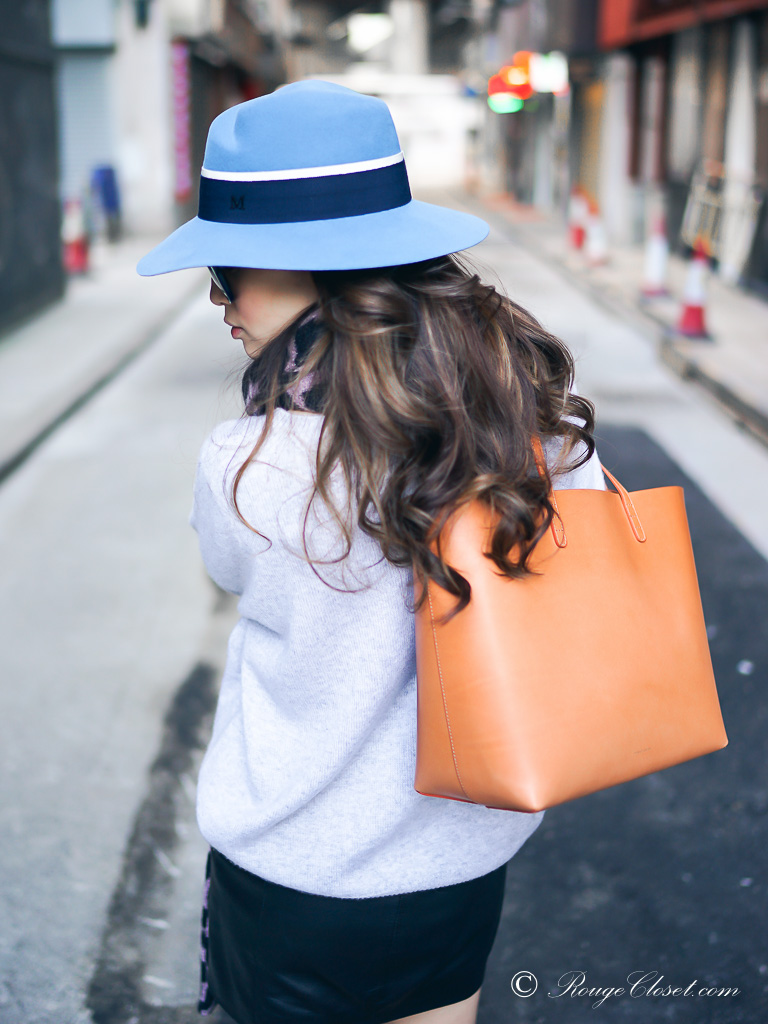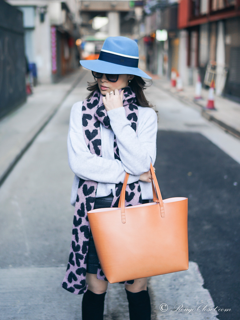 I didn’t go along with the stripes shirtdress and camel shoes yet, but I did style it in another comfy way. Oversized boyfriend cashmere sweater & leather mini skirt. Paired with a pair of over the knee suede boots. Pulling my look together with my felt fedora. The soft blue of the hat, the grey of my sweater and the pale pink of my scarf, altogether are the great canvas of my new cammello tote.