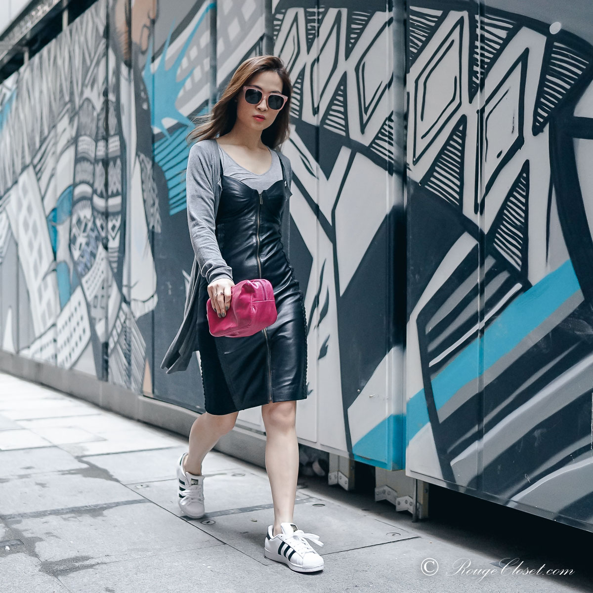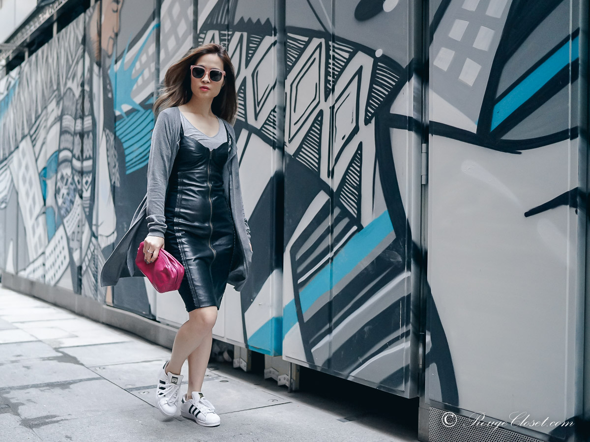 I love to dress up casual wear and I also like to dress down formal pieces. For leather dress, people may usually dress it in a sexy, feminine look with long boots, big earrings and some revealing of your chest. Yes, this looks really cool and attractive I agree. But I also love to dress it down so I can have more mix and match items for my weekend casual look. Here I put a jersey tee under my leather dress. This make me feel more comfortable and not so revealing. On top, find a drape cardigan to add layers and contrast the textures with the leather dress. Keep it casual in my white sneakers and finish the look with a pink or magenta pouch. Ahh! I wore a pink sunglasses to match my pink pouch too. Do you like it?