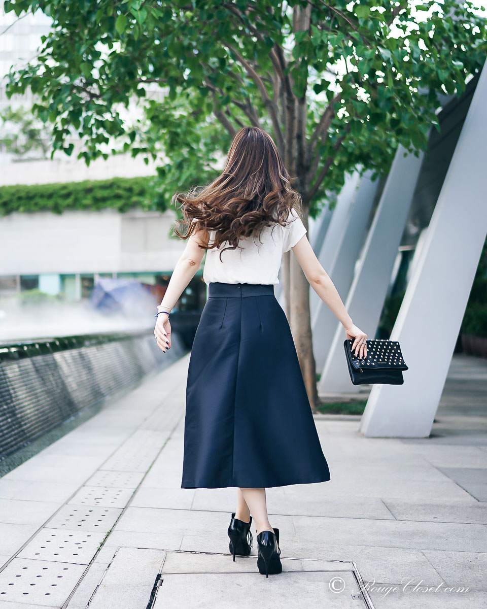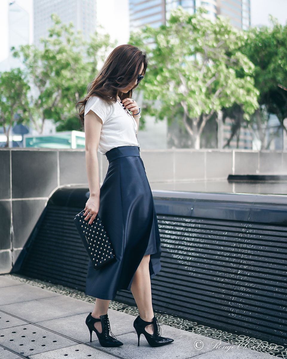 A well structured midi skirt is truly versatile. This ARIS navy structured midi skirt can be dressed with a crisp shirt to become a gorgeous office skirt. It can also be styled up as an evening event attire, thanks to its satin finishing on the fabric surface. A smart and stylish day to night closet staple. Here I styled it down with a linen T to make it became a Saturday brunch look. Easy yet standing out.