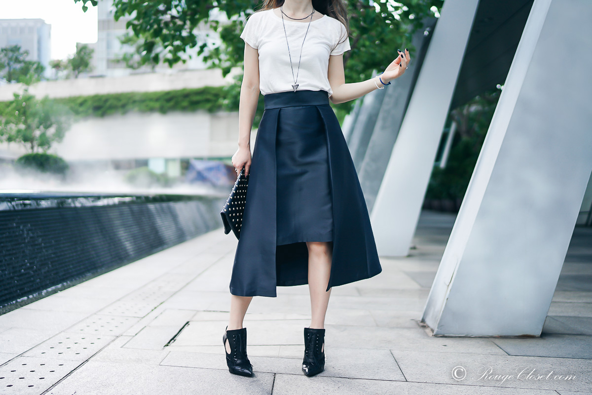 A well structured midi skirt is truly versatile.  This ARIS navy structured midi skirt can be dressed with a crisp shirt to become a gorgeous office skirt.  It can also be styled up as an evening event attire, thanks to its satin finishing on the fabric surface.  A smart and stylish day to night closet staple.  Here I styled it down with a linen T to make it became a Saturday brunch look.  Easy yet standing out.